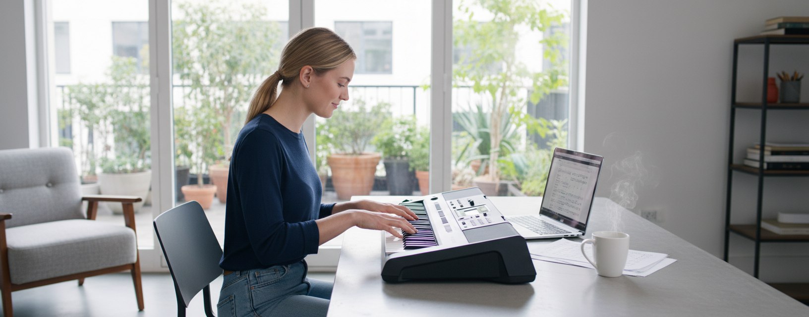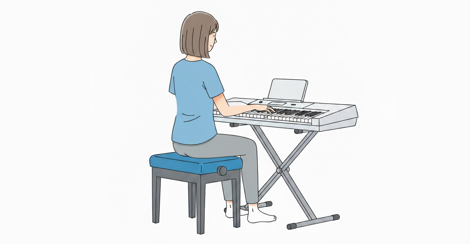- Стойка и стул: Используйте регулируемую стойку для синтезатора. Сидите на устойчивом, желательно регулируемом стуле (без колесиков). Идеальная высота — когда ваши предплечья параллельны полу, а локти находятся чуть выше уровня клавиш.