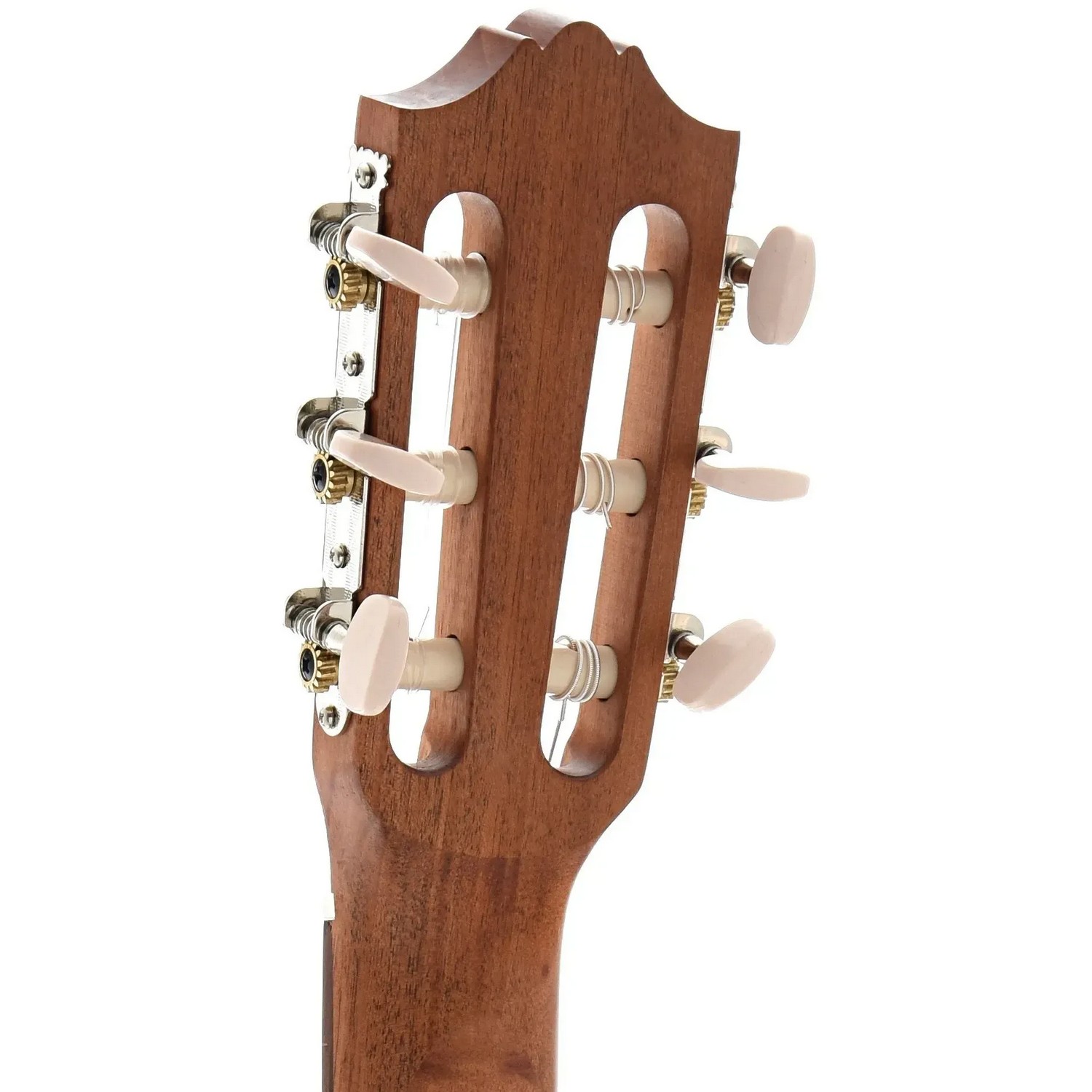 Стабильность строя критически важна для любого струнного инструмента, особенно портативного. Yamaha GL1 оснащается надежными хромированными колками открытого типа в конфигурации 3+3. Эта классическая схема обеспечивает равномерное распределение натяжения струн и прямой рабочий угол, что положительно влияет на стабильность строя и отзывчивость настройки.