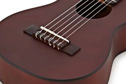 Крепление струн осуществляется классическим для нейлона способом — петлей на бридже, изготовленном из древесины сонокелинг, что обеспечивает надежную фиксацию и оптимальную передачу вибрации. Такой строй придаёт звучанию особую яркость и лёгкость, идеально подходящую для аккомпанемента и мелодичных переборов, и делает GL1 универсальным инструментом для музыкантов любого уровня.