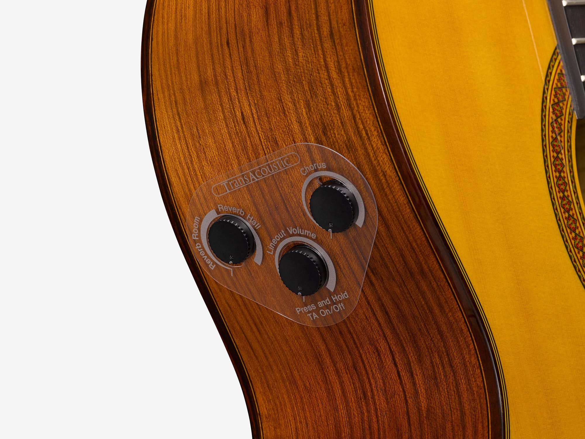 У CG-TA, единственной модели TransAcoustic с нейлоновыми струнами, нижняя дека и обечайки изготовлены из ованкола, что обеспечивает насыщенное и яркое звучание и придает инструменту классический и элегантный внешний вид.